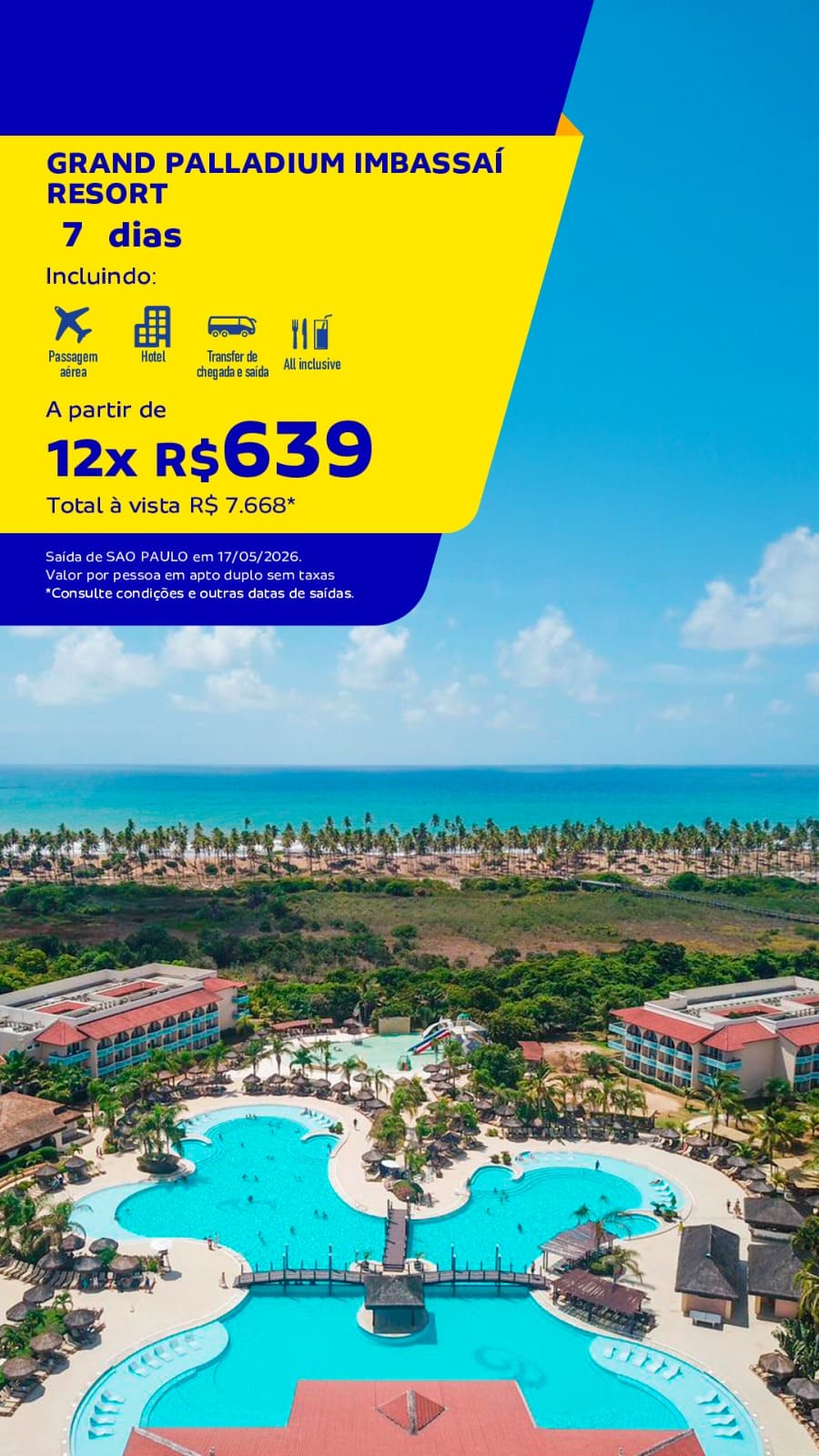 O Grand Palladium Imbassaí Resort & Spa é um resort premium, reconhecido internacionalmente pelo alto padrão de qualidade, serviços sofisticados e infraestrutura completa, sendo uma das melhores opções All Inclusive do litoral norte da Bahia. Ideal para casais, famílias, grupos e viagens de alto nível.